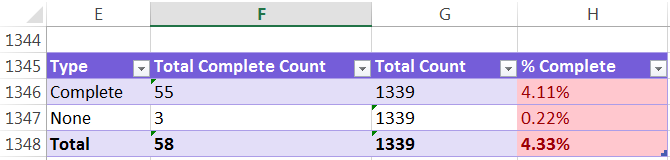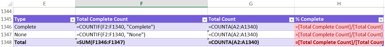 For example, to count the Complete Download, the formula is =countif(Range of Data, “Complete”). The formula will count all cells that contain the word “Complete” from the data table. Then count the total number of rows by with the CountA formula, written as: =counta(range of data). In the last column, divide the Total Complete by the Total Count to get the percentage completed.