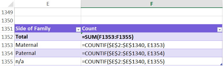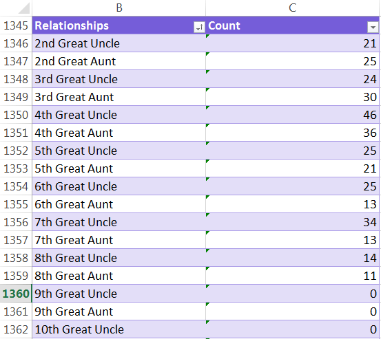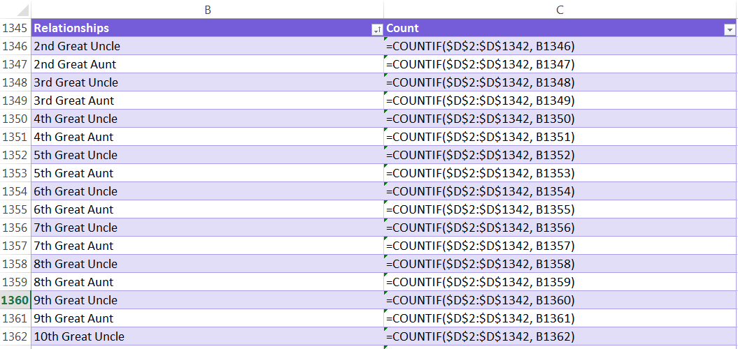 For example, to count the number of 2nd Great Uncles, the formula is =countif(Range of Data, Cell with the phrase “2nd Great Uncle” in it). The formula will count all cells that contain the matching phrase from the data table.