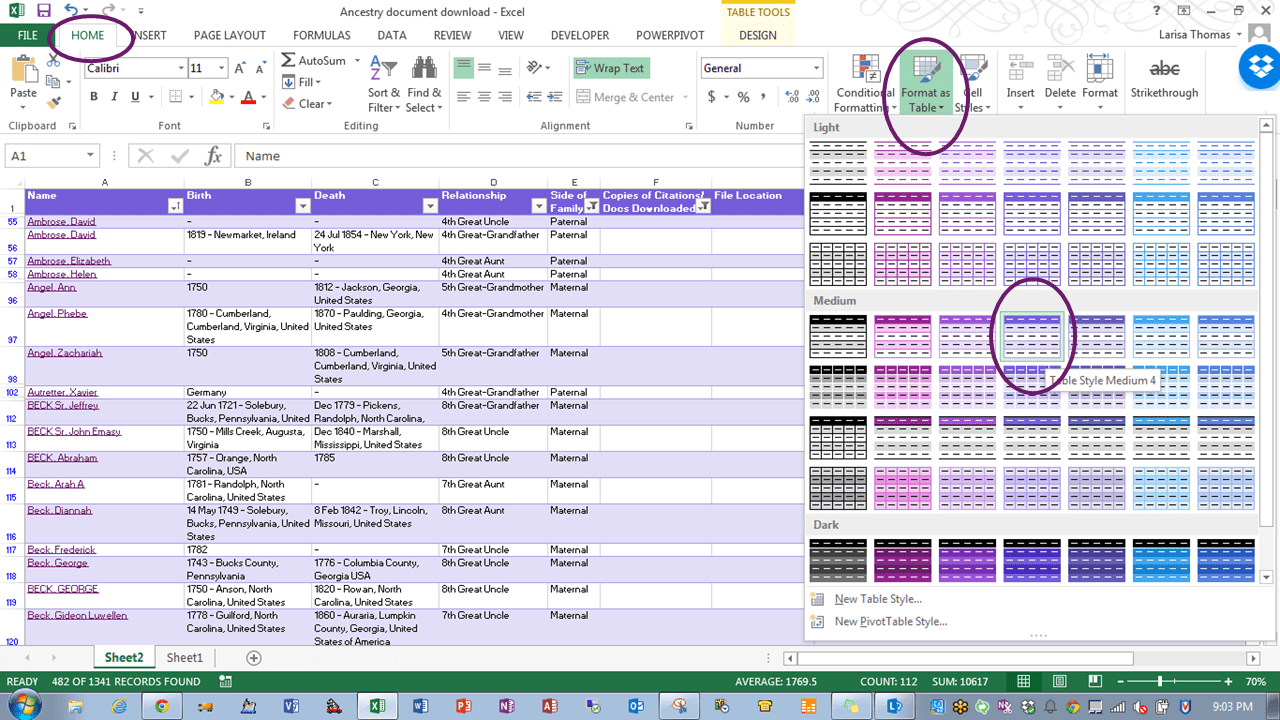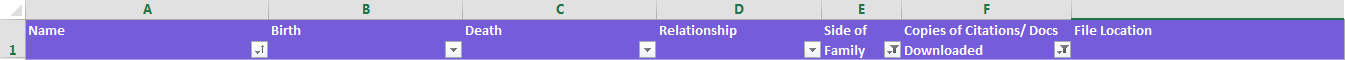Now that the spreadsheet is formatted the way I wanted, I worked my way through my family tree, surname by surname, noting the relationship and side of the family.