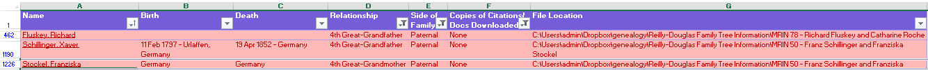 Now I can easily produce to do lists for research and downloading records for parts of my family tree by filtering the list based on surname, relationship type, side of the family, etc., depending on what part of my family tree I want to concentrate on.