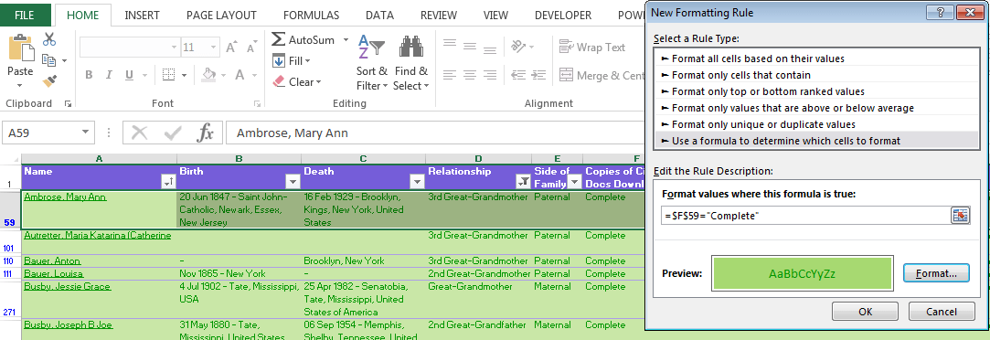 The next trick I use in Excel is Conditional Formatting. Whenever I enter the word “Complete” in the Download column, it will highlight the row in green so I can easily see which ancestors I’ve completed downloading the documents for. If the ancestor doesn’t have any source citations in their profile, I mark the column as “None”. Any marked with “None” get highlighted in red.